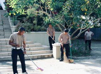 Rawat Toleransi, Personel Polres Kutim Kompak Bersihkan Halaman Gereja Bethany Sangatta