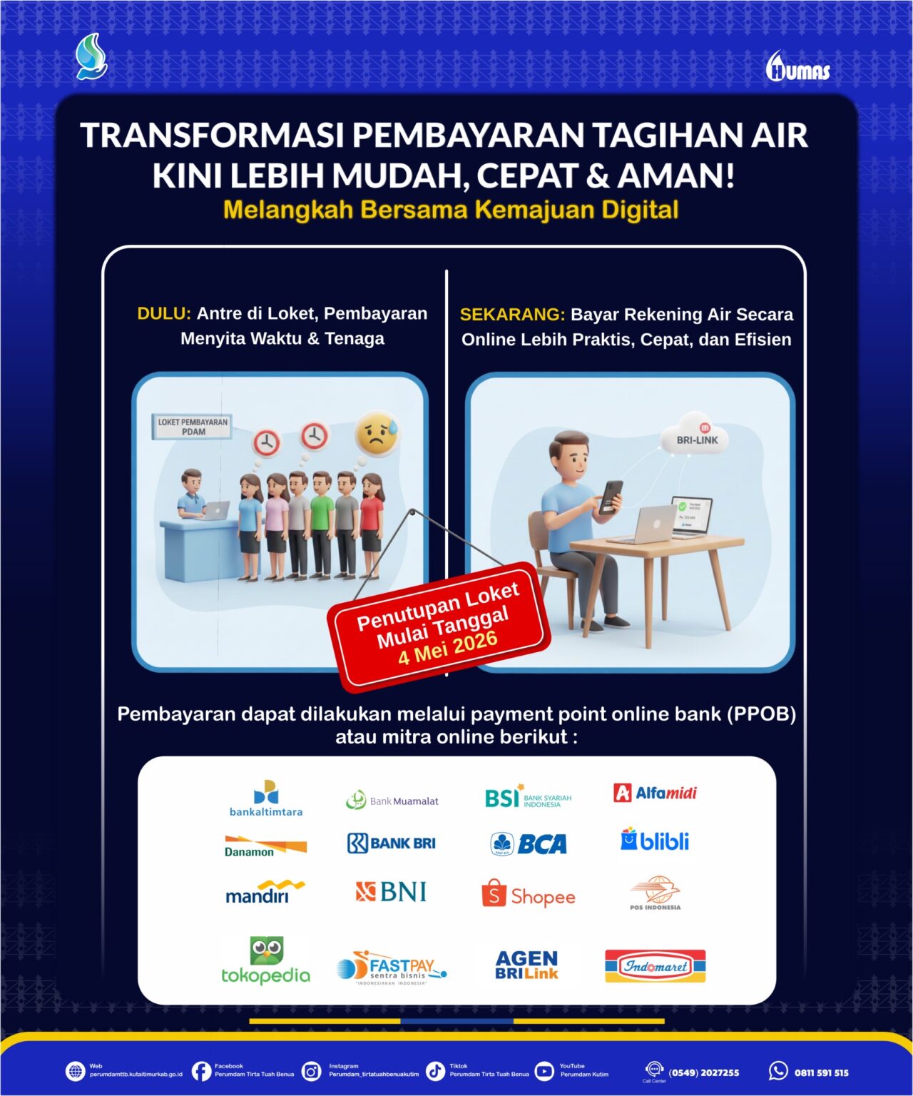 SANGATTA – Perusahaan Umum Daerah Air Minum (Perumdam) Tirta Tuah Benua Kabupaten Kutai Timur (TTB Kutim) melakukan terobosan besar dalam sistem pembayaran. Kini, pelanggan tidak perlu lagi terikat pada jam kerja kantor untuk melunasi tagihan air bulanan, menyusul penutupan loket kasir fisik dan pengalihan sepenuhnya ke sistem pembayaran daring (online).